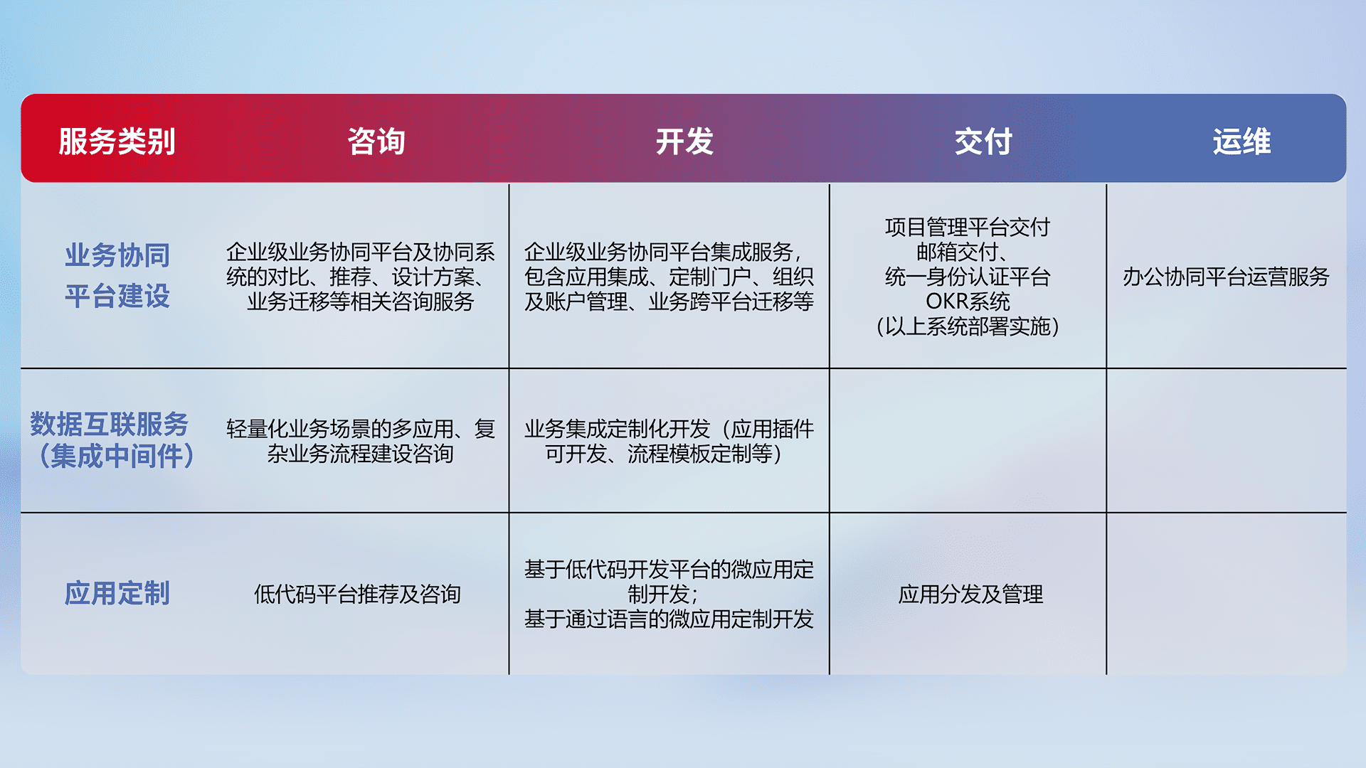 针对钉钉、、、、企微、、、IDaas等平台级产品提供产品的规划、、方案、、交付、、、定制化开发等服务,,,,实现如统一协同办公、、、智能客户服务、、、、混合会议管理、、智能数据查询、、、、等业务场景,,实现数字化转型。。